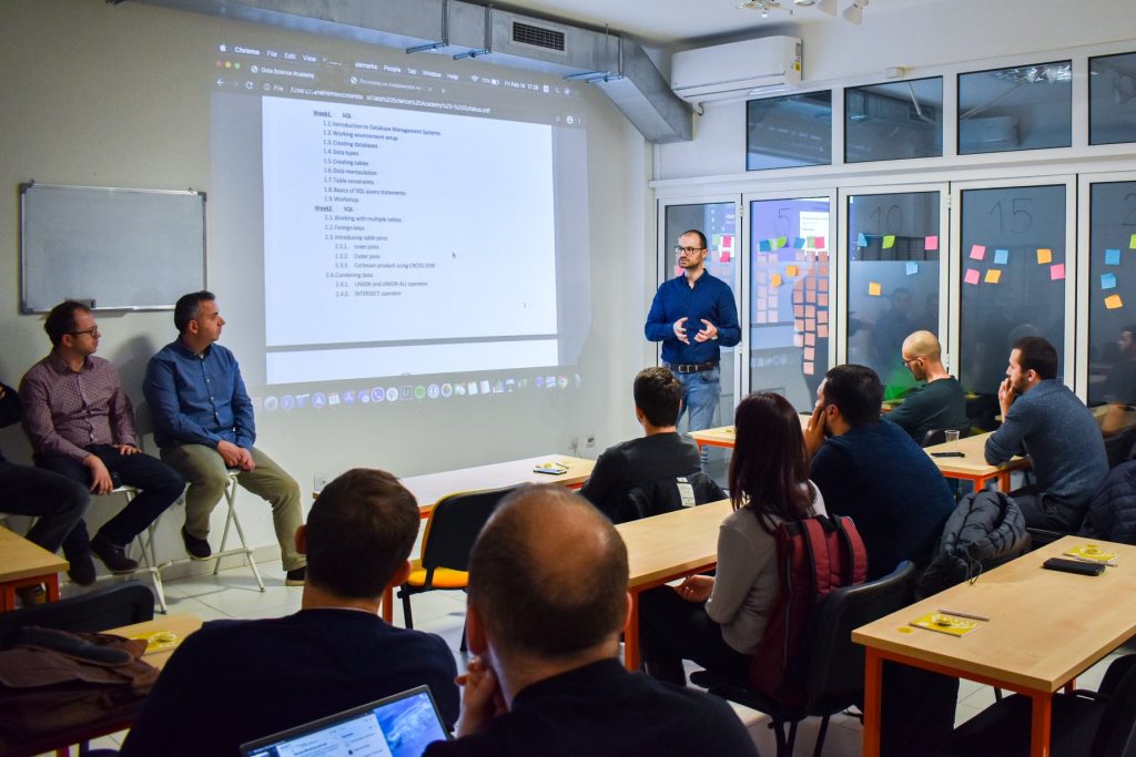 Ќе започнеме со најкомплексната програма, резервирана за најупорните, највредните и најталентираните – Академијата за Data Science. Пред малку повеќе од 1 година, меѓу 200 заинтересирани кандидати, ги избравме 18-те најодлучни и најподготвени, цврсто решени да „жртвуваат“ цела година од својот живот и комплетно да ја посветат на изучување на оваа комплексна област. Кога велиме комплетно, мислиме на цели 30 часа неделно, цела година.