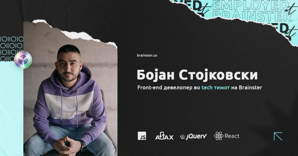 Едно од позначајните засилувања во Brainster tech тимот во изминатиот период е енергичниот и секогаш расположен Боко – Бојан Стојковски. После завршувањето на Академијата за Front End програмирање, беше на неколку месечна практикантска програма кај нас, а сега веќе работи како front-end developer во нашиот тим.