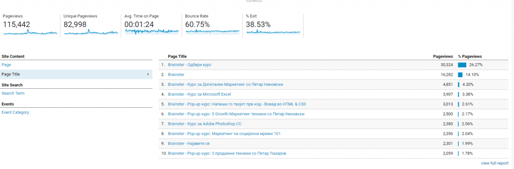 Овој извештај ќе ви помогне да дознате која од содржините што ги креирате се најинтересни за публиката. Доколку имате страница со продукти на продажба, тогаш може да дознаете кој продукт најчесто го гледаат посетителите, но и да пронајдете корелација со други продукти кои ги гледале во комбинација со него – па можеби да ги понудите во пакет.